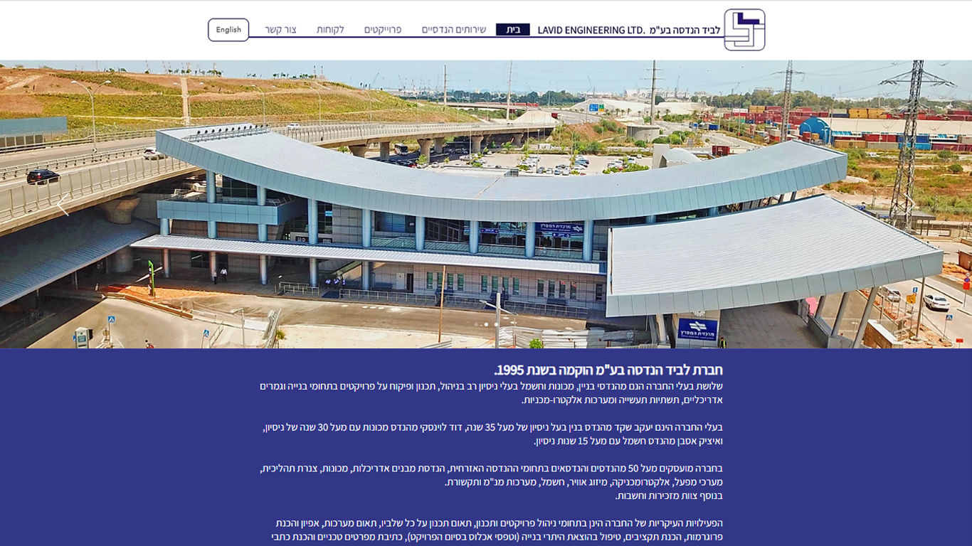 אתר תדמית רב‑לשוני (עברית ואנגלית) להגשת שירותי הנדסה מקצועיים של לחברת "לביד הנדסה בע"מ". פלטפורמת Wix משמשת לשילוב עמודי תוכן עשירים ויזואליים שמציגים את הידע, צוות ההנדסה ומגוון הפרויקטים (תשתיות, מבנים, תעשייה, מעבדות ועוד). ניתן ניווט חלק בין גרסאות השפה, וכל עמוד כולל מידע מקצועי ממוקד ופרטים ליצירת קשר.