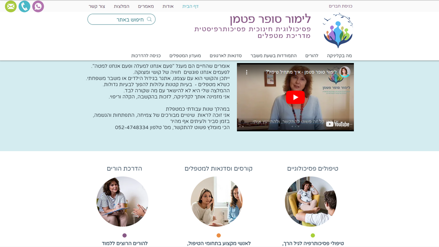 האתר של לימור סופר פטמן, פסיכולוגית ומדריכת אנשי טיפול, נבנה כאתר תדמית מקצועי עם תכנים מגוונים לקהל המטופלים ולאנשי מקצוע כאחד. האתר מציג שירותים טיפוליים לילדים, נוער ומבוגרים, מידע על טיפול CBT וביופידבק, וכן הכשרות מקצועיות למטפלים באמצעות קורסים וסדנאות.