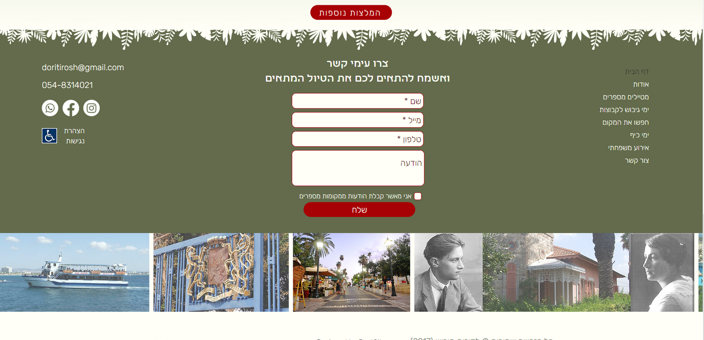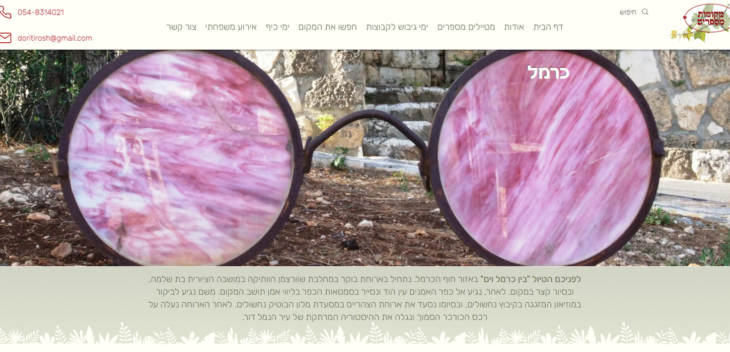 האתר של דורית תירוש מציג מדריכת טיולים מוסמכת המתמחה בארגון ימי גיבוש, סיורים חווייתיים ומשחקי ניווט קבוצתיים באזורים שונים ברחבי הארץ. האתר כולל עמודי תוכן מפורטים על מסלולים, סוגי פעילויות, והמלצות של משתתפים, לצד הסבר על משחק גיבוש מקורי בשם "חפשו את המקום".