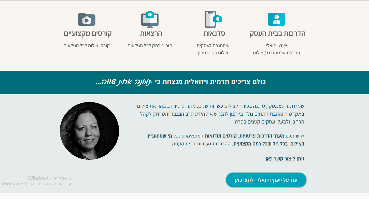 האתר מציג פעילות מקצועית של מרצה בכירה לצילום, בעלת ניסיון של עשרות שנים בהוראה אקדמית, אוצרות והדרכה. לצד ההוראה, מוצע שירות ייעוץ וליווי לבעלי ובעלות עסקים לשיפור נראות דיגיטלית, שפת מותג ובניית תדמית אישית בצילום. זהו אתר תדמיתי אישי שנבנה בגישת בניית אתרים בהתאמה אישית, עבור עסק קטן הפועל בתחומי ההדרכה, הייעוץ והצילום. האתר כולל עמודי תוכן מקצועיים, הצגת ניסיון ואקדמיה, טופס יצירת קשר, המלצות, עמוד שירותים והרשמה לפעילויות. העיצוב אישי ומדויק, ומבוסס על היררכיה ויזואלית שמבליטה יצירתיות וותק מקצועי. זהו פרויקט המדגים בניית אתרי תדמית מתקדמים ב-Wix, עם דגש על חוויית משתמש בהירה ומובילה לפעולה.